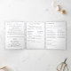 A design apresenta a aparência de um local branco como pano de fundo para o formato tradicional de uma missa nupcial católica. As palavras personalizáveis, "A Massa Nupcial de" são apresentadas como o título em cobrir e são seguidas pelos nomes de noiva e noiva. O design central apresenta uma cruz prateada com duas bandas de casamento douradas. A imagem esmaecida do sobrenome de casais grava o fundo. Possui espaço para até seis damas de honra e padrinhos de casamento, uma Menina Flor e Portadora de Anéis. Também inclui espaço para duas fotos, além de uma mensagem de gratidão e uma mensagem memorial opcional. Muito elegante. Projetado para coordenar com a coleção de Suite Casado Monograma Católico de Lace Branco.