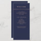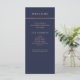 Este programa de casamento moderno e elegante apresenta texto rosa em fundo azul-da-meia-noite, com uma falso stripe de rosa-ouro no topo.