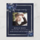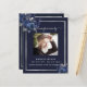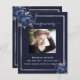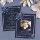 Um programa elegante de 2 páginas. Um fundo azul escuro, uma moldura prateada falsa, flores azuis e espaço para uma foto. Personalize e adicione nome, datas e seu texto.
