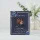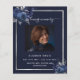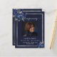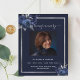 Um programa elegante de 2 páginas. Um fundo azul escuro, uma moldura prateada falsa, flores azuis e espaço para uma foto. Personalize e adicione nome, datas e seu texto.