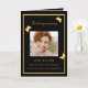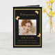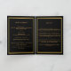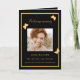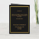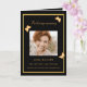 Um elegante programa de 4 páginas. Um fundo preto, uma moldura dourada falsa e espaço para a sua foto na frente. Decorado com 3 borboletas douradas. Personalize e adicione nome, datas e o seu texto. Texto dourado.