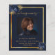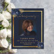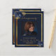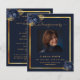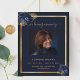 Um elegante programa de 2 páginas. Um fundo azul escuro, uma falso estrutura dourada, florais azuis e espaço para uma foto. Personalize e adicione nome, datas e texto.