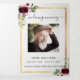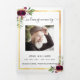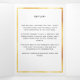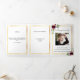 Um elegante programa triplo. Um fundo branco, uma falso estrutura dourada, florais burros e espaço para a sua foto. Personalize e adicione nome, datas e texto.