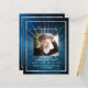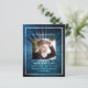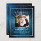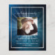 Um elegante programa de 2 páginas. Um céu azul escuro como fundo, uma falso armação prateada e espaço para uma foto. Luzes por trás da foto. Personalize e adicione nome, datas e texto.