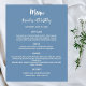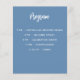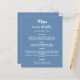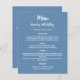 Um fundo azul tendencioso e empoeirado, texto branco. Frente: personalize e adicione seu nome, data e menu. Voltar: Programa. Se você tiver um grande programa, poderá reduzir o espaçamento entre linhas. 1 folha = 1 menu/programa impresso borda a borda.