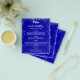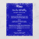 Por favor, note que este convite está no papel de folheto e é muito fino. Os envelopes não estão incluídos. Para convites mais espessos (mesmo design) visite nossa loja. Um fundo azul real. Texto branco. Decorado com falso brilho prateado, faíscas. Frente: personalize e adicione seu nome, data e menu. Voltar: Programa. Se você tiver um grande programa, poderá reduzir o espaçamento entre linhas.