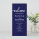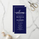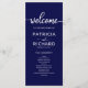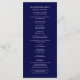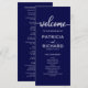 Um cartão de programa de cerimônia de casamento com letra azul marinho rústica chic. Adicione sua própria cor de fundo.
