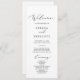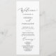 Este delicado programa de festas de casamento de caligrafia negra é perfeito para um casamento moderno. A design romântica minimalista apresenta uma magnífica e elegante tipografia negra num fundo branco com um aspecto simples e limpo. Inclua o nome da noiva e do noivo, a data e o local do casamento, a mensagem do obrigado, a ordem do serviço, a festa noiva e um memorial "em memória amorosa" opcional.