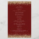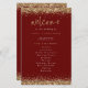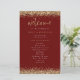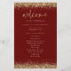 Programa Dourado de Casamento com Glitter Burgundy. Tamanho de 5,5" x 8,5" a um preço orçamentário, em uma elegante estoque LINEN de 110 lb - para um sentimento de luxo pelo valor do excelente, isso é perfeito para programas, convites e menus, etc. Este alternativo de tamanho de orçamento também está disponível em outras opções de papel. O estoque do cartão SEMI-GLOSS de 110 lb tem aproximadamente a mesma espessura do cartão postal, portanto também funciona bem para convites. O papel FELT de 100 lbs é colorido por buff, NÃO branco, então adiciona um toque rústico. O estoque de papel MATTE de 80 lb é branco brilhante, para impressão nítida, excelente para seus menus e programas, enquanto o papel SATIN de 80 lb é fino e leve, ideal para gabinetes. Este design elegante tem bordas de ouro reluzentes em cada lado. Bem-vindo está em um script de estilo manual informal definido e o resto das palavras que você pode personalizar facilmente.