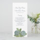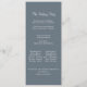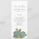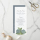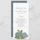 Buquê floral de Hídrangea azul Dusty em um belo Programa de Cerimônia de Casamento. Um simples design de flor azul com uma bela escrita botânica.