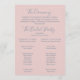 Este programa de casamento empoeirado de rosa florais é perfeito para um casamento de primavera ou verão. A design floral romântica apresenta flores lilás roxas, cor-de-rosa-pincel e pêssego dispostas em um buquê pastel macio lindo. Inclua o nome da noiva e do noivo, a data e a localização do casamento, a mensagem do obrigado, a ordem do serviço e a festa noiva.