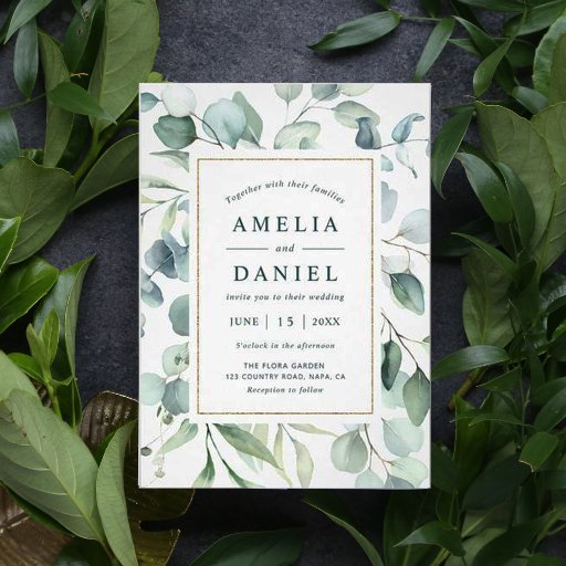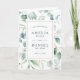 Este programa de cerimônia de núpcias dobradas apresenta cor d'água eucalipto e folhas verdes botânicas com uma estrutura retangular de ouro. Para personalização mais avançada deste design, clique no link Personalizar mais para alterar a fonte, o tamanho e a cor.