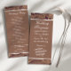 O Elegante Programa Plana de Casamento de Papel Marrom amassado combina encanto rústico com um toque moderno e sofisticado. Feito para se parecer com papel marrom amassado, o fundo texturizado evoca uma sensação natural e orgânica, enquanto a elegante tipografia, muitas vezes em tons brancos ou metálicos contrastantes como ouro ou prata, acrescenta um toque refinado. Este design de programa plano apresenta lindamente detalhes da cerimônia de casamento, oferecendo um equilíbrio na moda entre casual e elegante. Ideal para casais que buscam um tema de casamento vintage, terrestre ou boho-chic, ele acrescenta um elemento único e memorável à decoração geral do casamento.