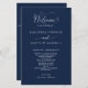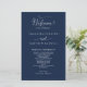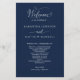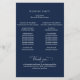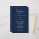 Elegante marinho Blue Wedding programa com belos detalhes caligraficos modernos manuscritos. Frente com detalhes da cerimônia de casamento, volte com nomes de festa de casamento e obrigado que envie para seus convidados. Adicione seus detalhes usando as caixas de texto modelo fornecidas e, se necessário, você poderá selecionar "Editar usando a ferramenta design" (com o botão localizado no final das caixas de texto modelo) e fazer alterações no posicionamento, tamanho ou até mesmo estilo do texto para ajustado melhor dos seus detalhes. Este design em uma cor azul marinho de fundo e texto branco.