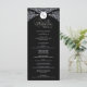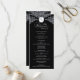 Este programa de casamento apresenta um fundo negro arrojado, enquadrado com florescimento de damascos brancos ornamentado, dando a ele um estilo formal e eterno. No topo, uma crista decorativa exibe as iniciais, enquanto o centro da design apresenta os nomes do casal e todos os detalhes do serviço de casamento em um layout organizado e limpo. O contraste entre preto e branco cria um olhar impressionante que enfatiza elegância e sofisticação, fazer-o uma escolha perfeita para casamentos tradicionais ou noturnos.