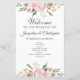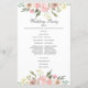 Um belo programa floral cor-de-rosa e marfim para o seu casamento de primavera ou jardim. Este elegante papel de carta de eventos é decorado com um buquê romântico de flores de aquarela que se aproximam do topo e do fundo. Preencha suas informações profissionais na frente e seus detalhes do partido noivo nas costas.