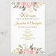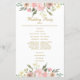 Um belo programa floral cor-de-rosa e marfim para o seu casamento de primavera ou jardim. Este elegante texto de evento é decorado com um buquê romântico de flores de aquarela que se aproximam do topo e do fundo em torno do guião de ouro chico. Preencha suas informações profissionais na frente e seus detalhes do partido noivo nas costas.