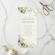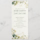 Este programa de casamento apresenta um design botânico fresco e elegante, com folhas de eucalipto verde macio e galhos de ouro delicados, enquadrando tanto o topo quanto o fundo da carta. O fundo claro e a fonte serif moderna criam um aspecto refinado e arejado, fazer os detalhes da cerimônia e os nomes de festas de casamento fáceis de ler. A frente destaca o casamento de nomes, com uma ordem clara de cerimônia. O reverso lista a festa de casamento do cheio, incluindo oficial, pais, madrinha de casamento, melhor homem, damas de honra, padrinhos de casamento, florista e portadora de anéis. Este cartão de lado duplo é perfeito para casamentos de jardim, primavera ou ao ar livre, oferecendo um toque natural e sofisticado.