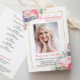 Este elegante programa memorial apresenta bonito flores de aquarela que enquadram a foto do seu amado. O dentro apresenta duas fotos adicionais ao lado do obituário, a ordem de serviço, o texto do arranjo, os reconhecimentos e as informações de recepção do funeral, se desejado. Este programa pode ser personalizado ainda mais clicando no botão "ferramenta design" na parte inferior da caixa de personalização, se desejar.