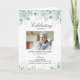 Programa memorial funerário com uma fotografia do falecido, seu nome, datas, local do evento, data do evento e elegante com folhas verdes em aquarela. Na dentro está um obituário, e a ordem de serviço; e atrás de outra foto, uma nota de agradecimento e o segundo lugar para depois do funeral. Para mais personalização, clique no link "personalizar mais" e use nossa ferramenta design para modificar esse modelo. Se precisar de ajuda ou itens correspondentes, entre em contato comigo.
