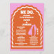 Nosso programa de ordem de serviço do estilo retrógrado mínimo e ousado é perfeito para o casal da moda que ama se destacar e fazer uma declaração ousada. Nosso design apresenta uma combinação de cores rosa-laranja-forte e brilhante. Formas simples de arco ondulado e círculo de abstrato criam uma aparência em negrito com "Fazemos." exibido ousadamente em letras grandes brancas. O verso apresenta um simples design moderno, com um monograma ousado e um endereço opcional do website do casal