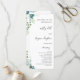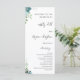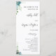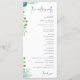Cartão de programa para celebração de casamento projetado com fontes florais azuis empoeiradas, texto minimalístico e nomes caligrafia.
