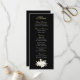 Este menu preto escuro com guião dourado e branco é simplesmente elegante. Um buquê floral agarra o fundo do menu. Os nomes dos casais estão nas costas com uma marca dourada. Perfeito para qualquer ocasião... todos os campos podem ser personalizados para seu almoço ou janto. Nomes opcionais no verso para casamentos e aniversários