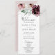 Este programa de casamento floral romance é perfeito para um casamento elegante. A moderna design do bico rústico apresenta flores românticas a aquarela em tons macios de burgundy, mauve, rosa-pincel e branco-creme com folhas verdes. Inclua o nome da noiva e do noivo, a data e o local do casamento, a mensagem do obrigado, a ordem do serviço, a festa noiva e um memorial "em memória amorosa" opcional.