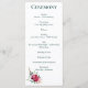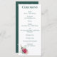 Uma placa de programa divertida e na moda com a sua ordem de cerimônia em texto verde escuro contra um fundo transparente. O verso mostra a festa de casamento com um fundo verde-escuro rico. O programa é acentuado por rosas de burlões, peônias cor-de-rosa e penas para um sentimento boêmico.