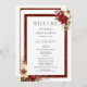 Esta design de Natal romântica e clássica ou de inverno apresenta grupos de flores vibrantes vermelhas e brancas de inverno, pínus, bagas ocas e galhos rústicos, gráficos personalizados de texto moderno e campos de texto editáveis cercados por uma rica borda vermelha damask com bordas douradas.