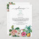 Um belo design de casamento de flores aquáticas tropicais e verde. Um design único que usa botânicos com coloração aquosa, como Hibiscus, Plumeria e Abacaxi. Um design floral moderno, branco e tropical, com um traço de verde. Um design do programa Itinerário de casamento com elementos modernos. Os convites de casamento e outros artigos de papelaria também estão disponíveis.