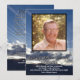 Personalize um programa de funeral com a foto do falecido amado. O fundo mostra uma foto de um pôr do sol atrás de montanhas silenciadas com nuvens em linhas. A citação, "A vida é eterna, e o amor é imortal, e a morte é apenas um horizonte; e um horizonte não é nada além do limite de nossa visão", de Rossiter Worthington Raymond está na frente abaixo da foto, nome e anos de vida. Na parte de trás está espaço para a ordem dos serviços para o funeral, a lista de palestrantes, e outra citação, "Como um pássaro cantando na chuva, que memórias agradáveis sobrevivem no tempo da tristeza", de Robert Louis Stevenson. Fotos e texto são configurados para serem personalizados com suas próprias fotos e texto. Se precisar de ajuda para personalizar, entre em contato comigo em jen@jenaleefamilystorykeeper.com