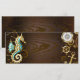 Fundo de madeira castanho com fundo marinho, cordilheira mecânica, volante antigo, âncora de ouro e diversas engrenagens de ouro e latão. Estilo Steampunk.