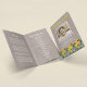 Celebração de um programa de vida com um fundo de madeira rústico, no cobrir da frente uma foto da pessoa que faleceu, seu nome, datas e girassóis amarelos brilhantes. Na dentro está um obituário e uma ordem de serviço; e no verso uma nota de agradecimento e os detalhes posteriores.
