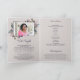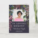 Programa funerário em púrpura escura com folhas em cor-de-rosa, rosa, verde-oliva e azul penduradas como um quadro acima de uma foto do seu amado. Adicione o nome do seu amado em um roteiro rústico. Dentro, você pode adicionar outra foto junto com um obituário e a ordem de serviço.