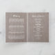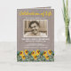 Celebração de um programa de vida com um fundo de madeira rústico, no cobrir da frente uma foto do falecido, seu nome, datas e girassóis amarelos brilhantes. Na dentro é um obituário e uma ordem de serviço; E no fundo, uma nota de agradecimento e os detalhes posteriores.