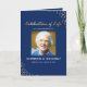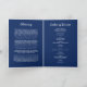 Celebração de um programa de vida com um fundo azul na moda que pode ser mudado para qualquer cor, no cobrir frontal uma foto do falecido, seu nome, datas e brilho dourado. Na dentro é um obituário e uma ordem de serviço; E no fundo, uma nota de agradecimento e os detalhes da recepção.