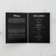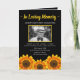 No programa Loving Memory que apresenta no cobrir frontal uma foto do seu ente querido, seu nome, datas, local da memória, data do evento em texto branco sobre fundo preto com três girassóis amarelos. Na dentro está um obituário e uma ordem de serviço; e atrás, uma nota de agradecimento e o local do acordar.