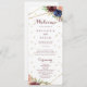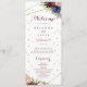 Este programa geométrico de caligrafia de ouro é perfeito para um casamento rústico. O design apresenta uma aquarela desenhada à mão, púrpura, marinho, pincel, burgundy, flores marinhos, folhas verdes e douradas que adornam uma elegante moldura geométrica.