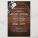 Programa de casamento geométrico floral azul marinho escuro com buquê elegante de azul marinho, azul real, branco, rosa bege e folhas de eucalipto verde-sage e moldura geométrica neutra brilhante em fundo de madeira rústica. Por favor, entre em contato comigo para qualquer ajuda na personalização ou se você precisar de qualquer outro produto com este design.