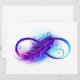 Símbolo do infinito com uma bela pena pintada em cores vibrantes roxas e azuis sobre um fundo branco.
