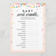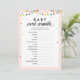 Jogo de chá de fraldas do tema fiesta com luzes coloridas de cordas e confete. A palavra de bebê se mexe - desembaralhe os itens relacionados ao bebê - o primeiro que mais ganha no tempo alocado!