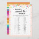 Jogo de chá de fraldas do tema fiesta com luzes coloridas de cordas e confete. O jogo de chá de fraldas é "bebês ao redor do mundo" onde você combina a palavra para bebê com a língua. Divertido para todos os chás de fraldas!