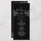 Um programa de casamento elegante, moderno, preto e branco com corda prateada e um lugar floral dourado.