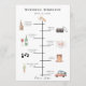 Elementos do dia de casamento de cor d'água, do programa da linha do tempo. O cartão apresenta igreja, câmera, garrafa com vidro, ajuste de placa, notas de música, bolo, buquê e carro retrô. A parte traseira do cartão apresenta flores aquarelas em tons de azul empoeirado com cor de fundo correspondente. O estilo e a cor da fonte do texto podem ser personalizados.