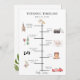 Elementos do dia de casamento de cor d'água, do programa da linha do tempo. O cartão tem a igreja, a câmera, a garrafa com vidro, a configuração de placas, as notas de música, o bolo, o buquê e o carro de corrida retrô. A parte traseira da carta apresenta ramificações verdes de jardins de aquarela. O estilo e a cor da fonte do texto podem ser personalizados.