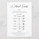 Cartão moderno minimalista de boas-vindas ao casamento e do programa de eventos do fim de semana. Modelo, mensagem de boas-vindas na linha de tempo do itinerário da frente e do fim de semana no verso. Ícones do dia de casamento incluem anéis, coquetéis, ajuste de refeições, bolo, nota musical e confete.
