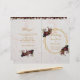 Um programa de casamento dobrado em fundo de mármore, com decorações de peões vermelhos e brancos arrojados e um hexágono de ouro irregular em volta do texto no cobrir frontal, com peônias sobre ele, para cima e para baixo, à esquerda. Há também montanhas de peonias na dentro superior da fronteira e pequenas peonias decoram sob o texto do cobrir traseiro. O texto tem uma cor de ouro, como o hexágono-ouro, e os títulos e os nomes do noivo e do noivo são escritos em um roteiro caligráfico elegante. Tem a cerimônia de casamento e a festa de casamento na dentro e uma obrigado que você manda no cobrir traseiro.