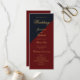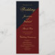 Um moderno programa de casamento azul-marinho e burgundy com texto dourado.