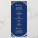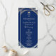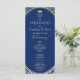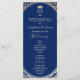 Simples, moderno, elegante, programa de casamento azul marinho da caligrafia com a estrutura de arte-deco dourada e o monograma real no topo.